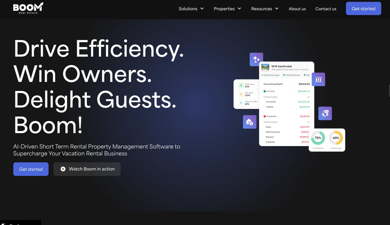 Boom markets itself as the world’s first AI-driven short-term rental PMS, launched in 2024. Built by property managers, Boom’s platform focuses on streamlining operations, enhancing guest satisfaction, and maximizing owner engagement through artificial intelligence. One of Boom’s key differences is its flexible, modular design – you can use it as a standalone PMS or layer its AI capabilities on top of your existing systems. This makes Boom an attractive option if you’re interested in AI automation but not ready to fully switch off your current software.